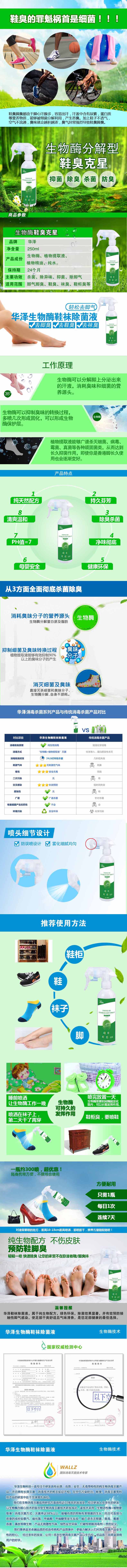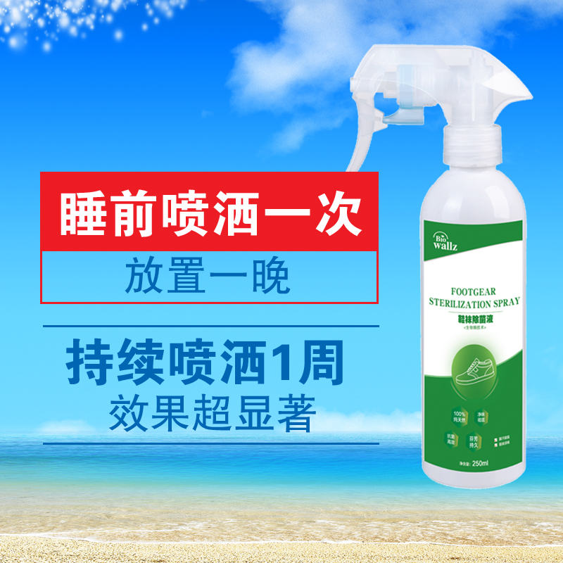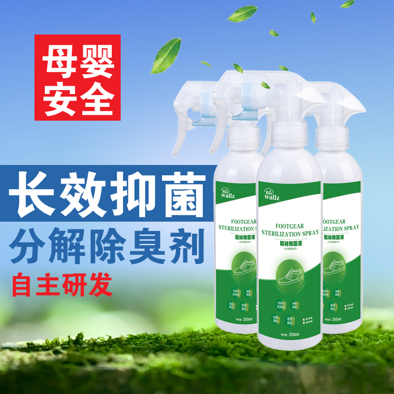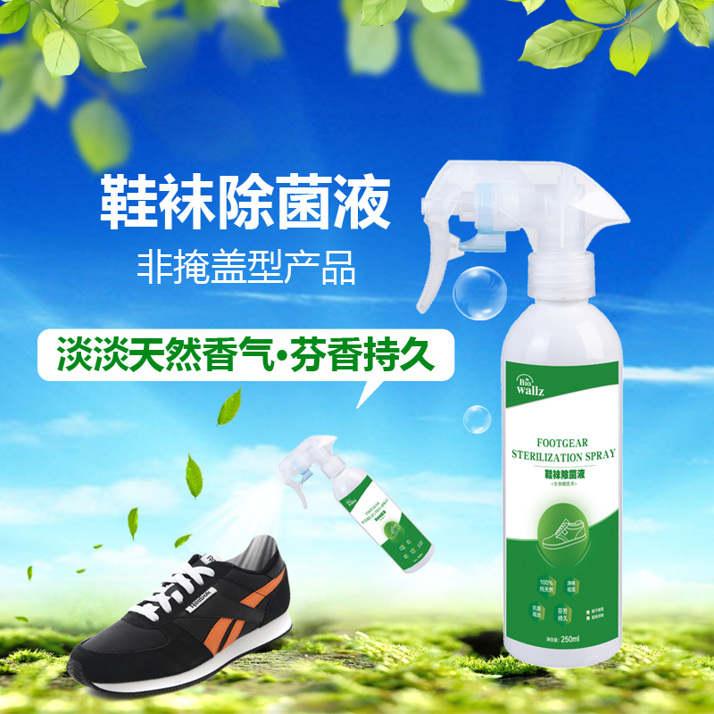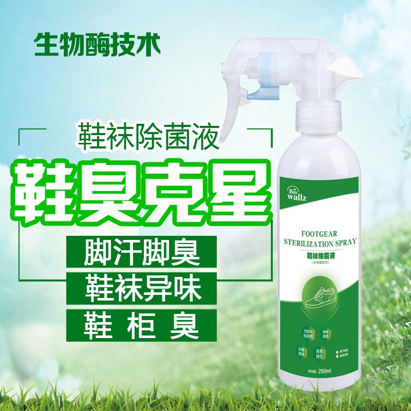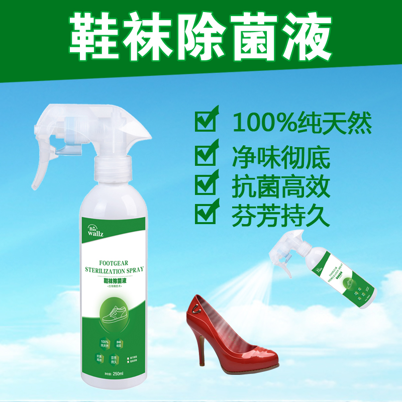 wallz 鞋襪除菌液,利用專用生物酶及植物提取液降解汗液、廣譜殺滅細菌、病毒、霉菌、真菌等各種頑固細菌,并抑制產生臭味的微生物生長。本產品只含有純天然生物活性物質,高效殺菌,持久祛味,綠色環保,除菌效果顯著,并有效預防接觸性腳氣感染,使足部干爽舒適且氣味清香,是您足部健康的最佳選擇。